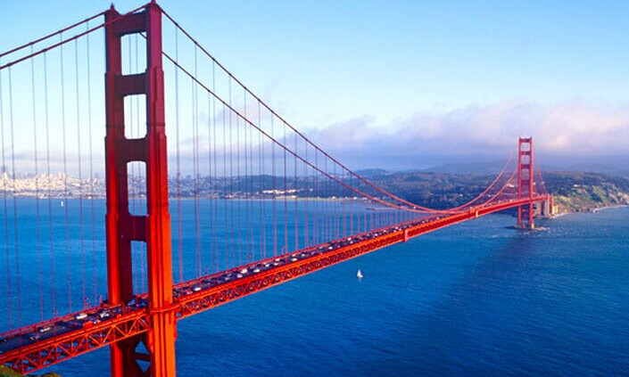 雄跨金门海峡的金门大桥于1937年建成, 长2. 7公里,从海面到桥中心部的高度约为67.84米, 两个主桥墩有65层楼高, 共用了2.4万吨钢缆, 耗资3550万美元。金门大桥气势宏伟、外形壮观、色调独特,被誉为近代桥梁工程的一项奇迹,是旧金山的象征。她是世界上最大的单孔吊桥之一,每天都约有10万辆汽车从桥上驶过。 金门大桥的设计者是工程师史特劳斯的铜像安放在桥畔,以纪念他的杰出贡献。
