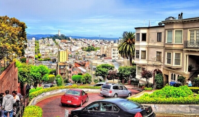 "世界上最弯曲的街道"的"九曲花街"路面坡度达40度以上。虽然对下坡的车辆驾驶员的车技是一大考验,但一直都很受欢迎。路边各具特色的漂亮房子映衬着车道两旁的漂亮花坛,赏心悦目,有名"花街"。自驾的体验更有意思。这一带开车转过了,你就会明白为什么旧金山是手动车驾驶者的地狱。花街下去第二个路口右转,是三藩目前最陡的一个上坡之一,自驾的话可以去试试。