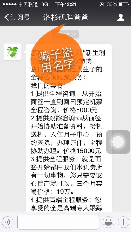 最近网上出现了不少仿冒版的@。除了QQ上,微信和微博上也有出现此类骗子,希望关注赴美生子的亲们多多关注新浪微博@喜多月子中心@ 以及我们的官方网站http://www.xiduobaby.com/ 查看最新官方讯息内容,以防上当受骗。请大家认准科普网站LApangbaba.com,喜多月子中心官网xiduobaby.com。一个科普为主,一个是月子中心网站。订阅号USApangbaba