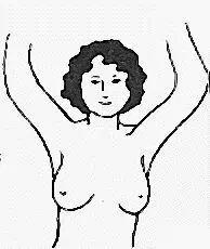 2.双手握住置于脑后,手稍往前压,注意观察镜中乳房外形、轮廓是否有前述异常之情形。