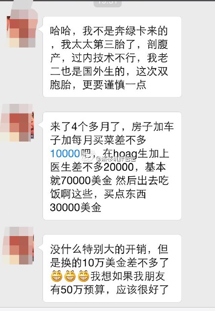这位客人是来美国生第三胎的,选择的是剖腹产,因为国内的技术不行,而且这次据说还是双胞胎,所以必须要谨慎一点,来到美国四个多月了,租房子,租车,找阿姨,在加上平时买菜,游玩,购物还是要很大的开销的,最重要的还有,这些花费算起来,真的是很高的。美国的人力费是很昂贵的,虽说物价便宜,可是其他的花费真的是不容小觑的。