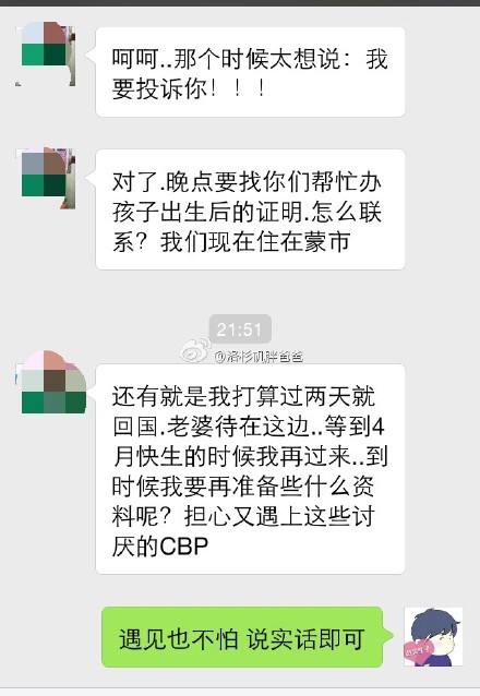 这位客人是我们的赴美生子诚实签的客人,签证就诚实告知了赴美生子的真实目的,而且他父母都有美国绿卡(就这样也没有怀疑移民倾向)。过海关的时候遇见了对赴美生子不友好的CBP官员愤愤不平。每个人的情况以及美国海关每段时间都可能不一样,具体方案可能有区别。