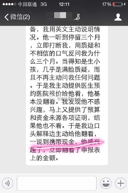 我主动提供医生预约单给他看,他基本没翻;我有马上提供了预算和资金来源各项证明,结果他也没看。但是一听到携带现金,他立马变得有兴趣了,翻看了申报表上的金额。