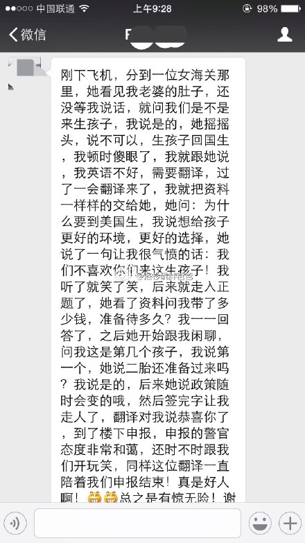 虽然遭遇这样的不友好开头,客人十分冷静,这个时候要求翻译,并将证明资料一件件递给CPB查看。这时候对方才问,为什么要到美国生。谈话才进行了下去。期间海关的工作人员讲了一句“我们不喜欢你们来这生孩子!”,让客人很气愤。但在这个情况下,与之争辩是很不明智的行为。我们要做的,是要保持冷静和自信,忽略对方的刺激性语言,有问有答,最终顺利通过!恭喜这个来自南京的客人,顺利入境美国。也衷心祝愿今后计划前往美国生孩子的家庭,能够在面对美国面签官及海关工作人员都能够沉着冷静,自信应对,取得通过!