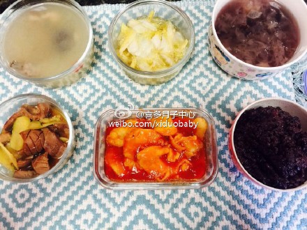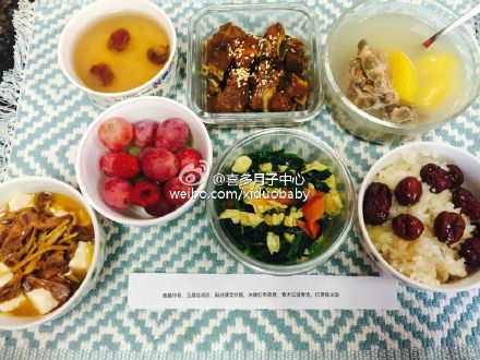 【喜多月子中心-饮食】茄汁鱼片,麻油猪腰,白菜鱼翅,紫薯银耳汤,白果沙参鸡汤,紫米饭。糖醋排骨,鸡胗烩豆腐,麻油菠菜炒蛋,冰糖红枣燕窝,木瓜排骨汤,红枣糯米饭。分享洛杉矶喜多月子中心的赴美产子宝妈月子餐菜肴实拍。