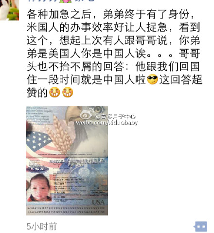 【中国宝宝的美国国籍】洛杉矶喜多月子中心科洛纳Corona豪宅里的杭州赴美生子宝妈近日领到了宝宝的美国护照,很幸福的一家四口,哥哥十分喜欢这个“美国”弟弟呢。