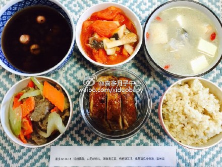 【赴美生子喜多月子餐】麻油猪肝,金针虱目鱼,红苋菜,芋头西米露,牛蒡党参鸡汤,红米饭。照烧鸡,芹菜炒牛肉,红茄杏鲍菇,红豆莲子汤,鱼头豆腐汤,糙米饭。肉骨茶,秋葵炒鸡片,丝瓜炒蛋,枸杞银耳汤,灵芝鸡汤,黑豆饭。