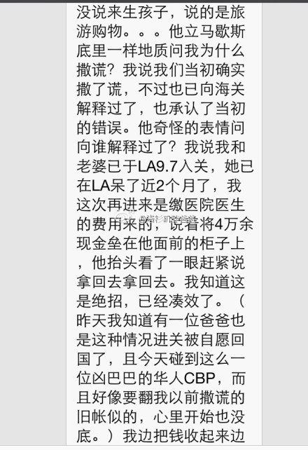 首先第一个问题就是去美国要干什么,客人如实回答说是老婆在这里生孩子,话还没有说完呢,CBP就瞪大了眼睛,看来生孩子对于他来说确实是一个敏感的词呀,听到答案后他立马就问了办理签证的时候是否有实话实说,当客人说没有的时候,他立马就歇斯底里了,仿佛客人得罪了他似的,于是客人就向他解释了之前过海关的事情,可他似乎还想抓着这件事不放。不过我们的客人也不甘示弱,立马将四万多美元现金堆在了CBP柜台上,CBP看了之后立马叫客人收起来,就这样,气场一下子就压倒了对方,接下来CBP就问客人要呆多长时间,之后就直接给了6个月的停留期,不得不说,这位客人实在是太强悍了。