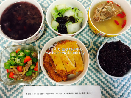 【赴美生子-饮食篇】和风鱼排,秋葵牛肉,白菜木耳,紫薯银耳汤,青木瓜排骨汤,紫米饭。分享美国洛杉矶喜多月子中心的月子餐与待产餐饭菜实拍。