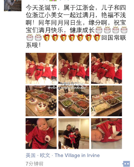圣诞节之日,尔湾公寓的五个可爱的美宝一起在喜多过满月啦!四个女宝宝,一个男宝宝,女宝宝有一对是双胞胎,大家齐聚在一起,为宝宝们庆祝在美国洛杉矶出生满三十天,工作人员们准备了一大桌丰盛的晚餐来为五个小美宝庆祝满月,这五个宝宝的家庭分别来自北京、南京、杭州和温州。大家因赴美生子而相聚,结缘,祝大家一切顺利,宝宝健康成长每一天!