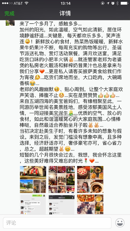 老郑风趣幽默、贴心周到,让整个大家庭欢声笑语、捧腹不知,实在是赞赞赞!来自五湖四海的美宝爸妈们,有缘相聚至此,一同游历举世闻名的美景胜地,感受浓郁美国风土人情,一同迎接美宝出生。优质的空气,放心的食材,如此和谐温暖窝心的大家庭氛围,心情棒棒哒,自然最适合养胎坐月子啦!