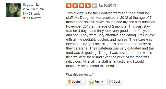这个评论是送给儿科病房和他们令人惊喜的工作人员的。2012年,我女儿7个月大时,因慢性肠道炎住进怀特纪念医院。2013年11月,我两个月大的儿子也住进了这家医院。我们在医院待了4天,他们非常细心地照顾了我和我的儿子。我只给了四颗星,是因为他们的自助餐厅非常的过时,而且食物很恶心。我们在医院时,烧烤从来没有,而且食物的价格比较贵。总而言之,这家医院的员工是非常棒的,我肯定会推荐这家医院。