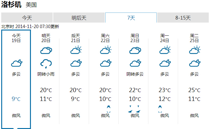 最近美国东部的天气可以说是非常的冷,洛杉矶与东部的天气比起来,真的是好太多了,洛杉矶未来一周的天气都会让人感到舒适。即将挥别白天温度80多度的温暖冬季,南加州各地的白天温度,将从周三起降温至少十度,而且因为受到低气压的影响,今天也将有降雨的可能性,不过这不会影响到下周感恩节的长周末,预测那天是个晴朗的好天气,大家还是可以尽情的去购物哦!