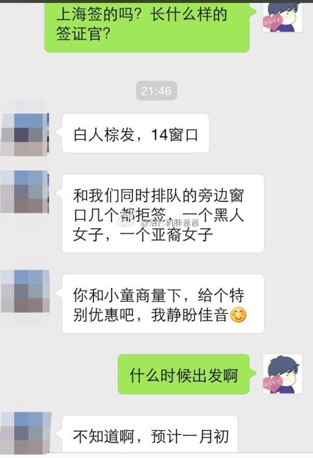 宝爸:白人棕发,14号窗口,和我们同时排队的旁边窗口几个都被拒签了,一个黑人女子,一个亚裔女子。
