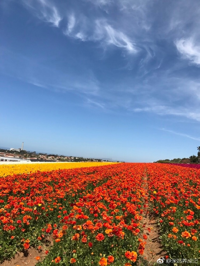 花田位于南加州卡尔斯巴德,在洛杉矶和圣地亚哥之间,我们月子中心是在洛杉矶,到卡尔斯巴德很是很方便的。卡尔斯欧巴德环境优美,被冠以“海滨村落”的雅称。卡尔斯巴德花田是世界上十大著名花田之一,每年的三到五月份,落英缤纷,姹紫嫣红。