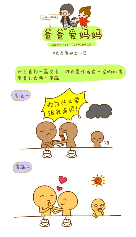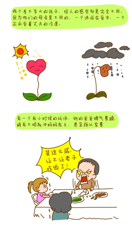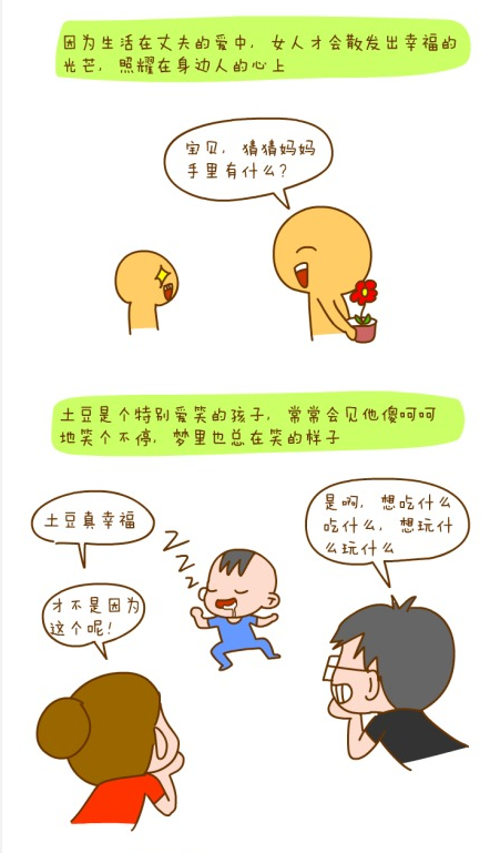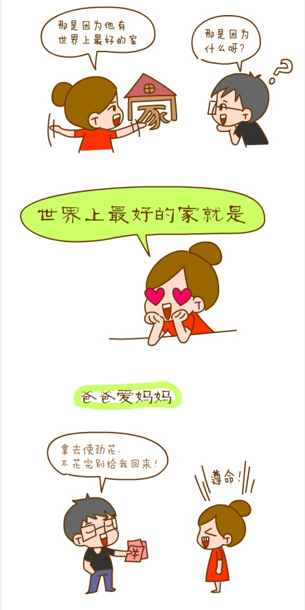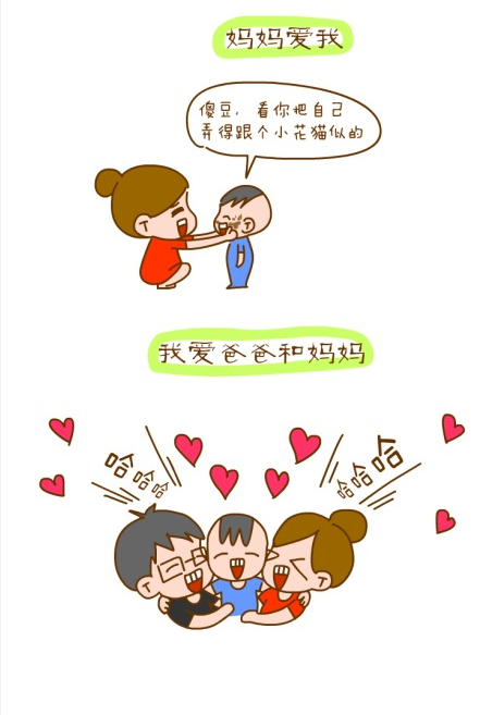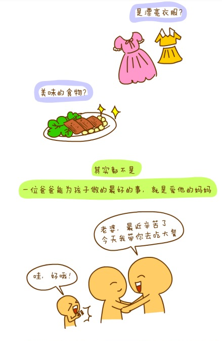 其实,每一个宝宝都希望有一个幸福的家,那幸福的家的定义到底是什么呢,答案很简单,在宝宝眼里爸爸爱妈妈就是世界上最幸福的家。孩子最想要的不是什么玩具,也不是什么好玩的好吃的,孩子最渴望的是父母所给予他们的爱。所以一个好爸爸能为孩子做的最好的事情就是爱孩子的妈妈,因为生活在丈夫的爱中,妈妈的心柔软而舒畅,温润而安定,她也会宽容的对待身边的每一个人,会制造出愉悦、温馨的家庭气氛,同时也会让宝宝感到幸福,所以啊,爸爸在幸福的家里面承担着最重要的角色。