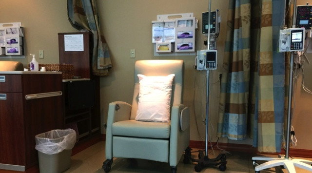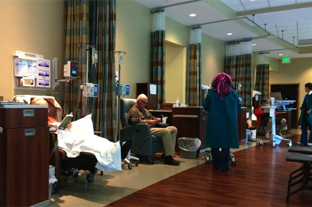 12、不需住院的治疗可以坐在这种舒适椅子上,在专门安静的区域里进行,每个椅子侧面的平板转出来就是电视屏幕。
