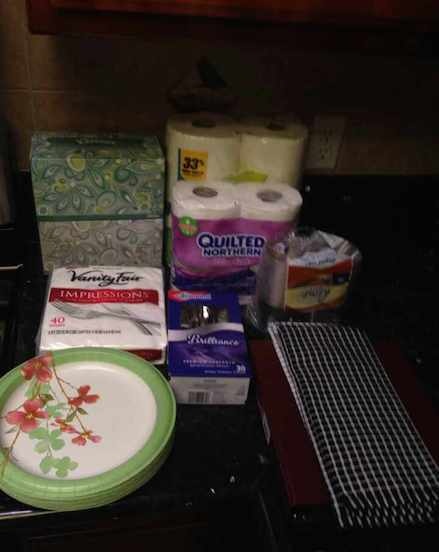 炉台干干净净,清洁如洗,旁边堆放着一批全新的用品:擦手纸、卫生纸、纸杯、纸盘,抹布(全新没使用过的抹布)。上面有一个白信封,写着“祝贺——希望你的新家是你梦想成真。”