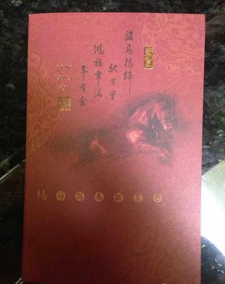 炉台的另一边是一盆鲜花和一盆绿植。我的天呢!——还有一个印着飞马的带着中文字“骏马扬蹄驰万里,鸿福常满年有余”的新年贺卡!