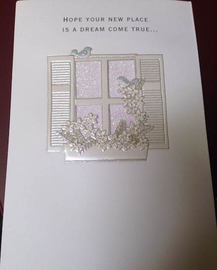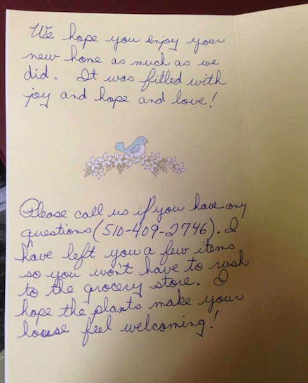 我读着贺卡内英文手写的内容,我的眼睛渐渐模糊了——“我们希望你们能象我们那样享受这个你们的新家。这房间里曾经充满了欢乐,希望和爱”“如有任何问题请给我们打电话(号码)。我给你们留下了一些必须的用品,这样你们就不致于急着为一点小事跑去商店。我希望这些植物和鲜花能让你们感受到被欢迎(进住)的氛围。”
