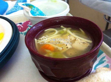 哈哈,看上去还是很丰盛的啊,美国的医院饮食还是相当不错的,不仅讲究荤素搭配,还能将一些甜点提供给妈妈们,从而减轻孕妇们产后的痛苦。这一点可以说是很贴心的
