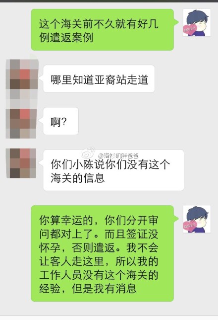 :你算幸运的,你们分开审问都对上了,而且办理签证的时候没有怀孕,否则就会被遣返,我不会让客人走这里,所以我的工作人员没有这个海关的信息,但是我有消息。