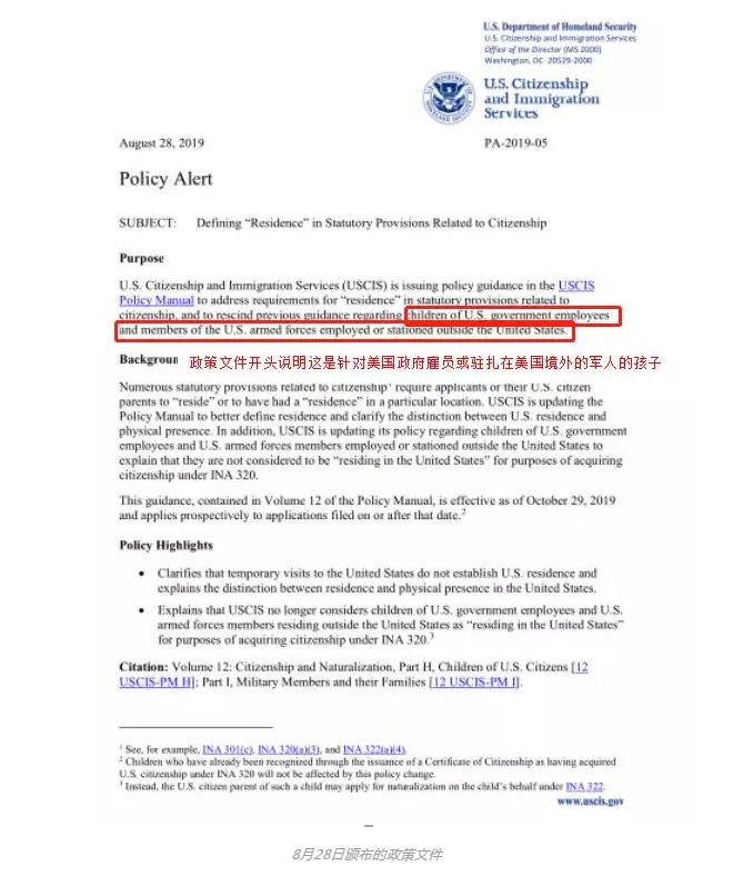 据美国CNN最新报道,美国公民及移民服务局(USCIS)发言人解释,事实是,10月29日起,境外出生美军和政府雇员子女不再自动获得美国国籍。政策改变的原因是,就政策同之前的移民法中对于“居住”的定义冲突。该政策不会影响出生公民权。