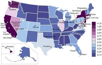 在美超过一半(57.6%)的华人都住在两个州:纽约(19.2%)和加州(38.4%)而超过60%的华人都住在大城市区(metropolitan regional urban area)