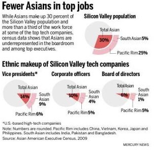 尽管新一代亚裔以及更多的华人在科技业占据多数,但仍然难以在职场上谋得高位:数据显示,2000年,只有38.7%的亚裔从事科技有关工作,2010年,已有过半亚裔从事科技工作