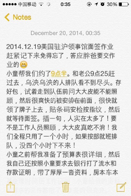小童帮我们约了九点半,和老公九点二十五赶过去,乌央乌央的人排队看不到尽头。存好包之后,试着走到队伍的前面问大肚皮能不能照顾一下,然后很爽快的被安排到了前面,很快就领了牌子上去了,贴条码,安检,按指纹,然后就是等待面签。